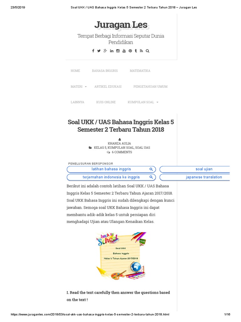 Soal Ukk Uas Bahasa Inggris Kelas 5 Semester 2 Terbaru Tahun 2018 Juragan Les