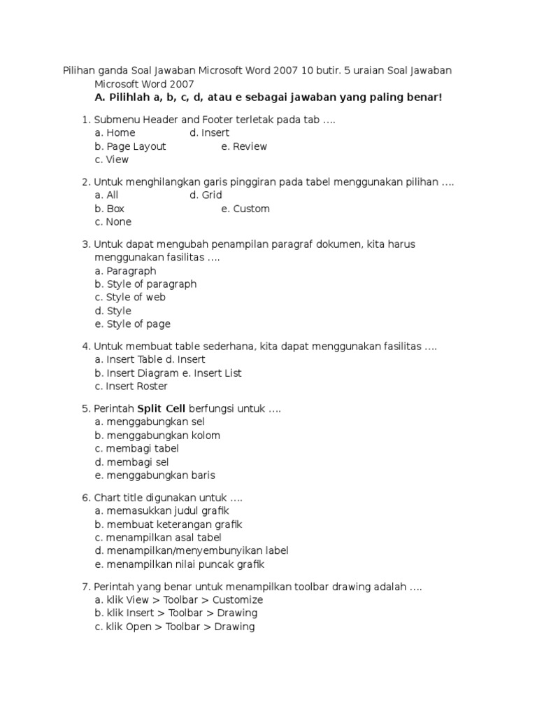 Pilihan Ganda Soal Jawaban Microsoft Word 2007 10 Butir